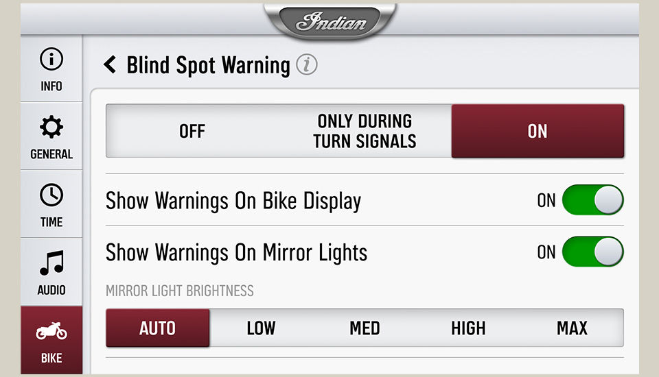 Le freinage combiné électronique est une fonction qui mesure l'action du conducteur sur les freins et les paramètres du véhicule pour calculer la répartition optimale de la force de freinage avant et arrière dans chaque situation de freinage. Par exemple, si seul le frein avant ou arrière est actionné, le système le reconnaît et applique automatiquement la force de freinage optimale aux freins avant et arrière. Cette fonction est intégrée à la technologie SmartLean d'Indian Motorcycle, de sorte qu'un freinage optimal soit appliqué à la fois en ligne droite et dans les virages.